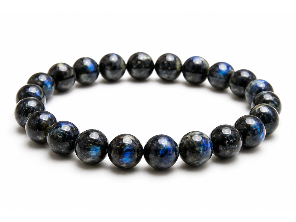 Náramek z arfvedsonitu je výrazný tmavý šperk s typickými modrými až modrozlatými odlesky („blue flash“ efekt), které se objevují při dopadu světla. Kámen má černo-šedý základ a působí velmi luxusně a tajemně. Používá se hlavně v moderních špercích. Tradičně je spojován se silou, intuicí a ochranou.Obrázek je pouze ilustrativní. Původ: Čína
