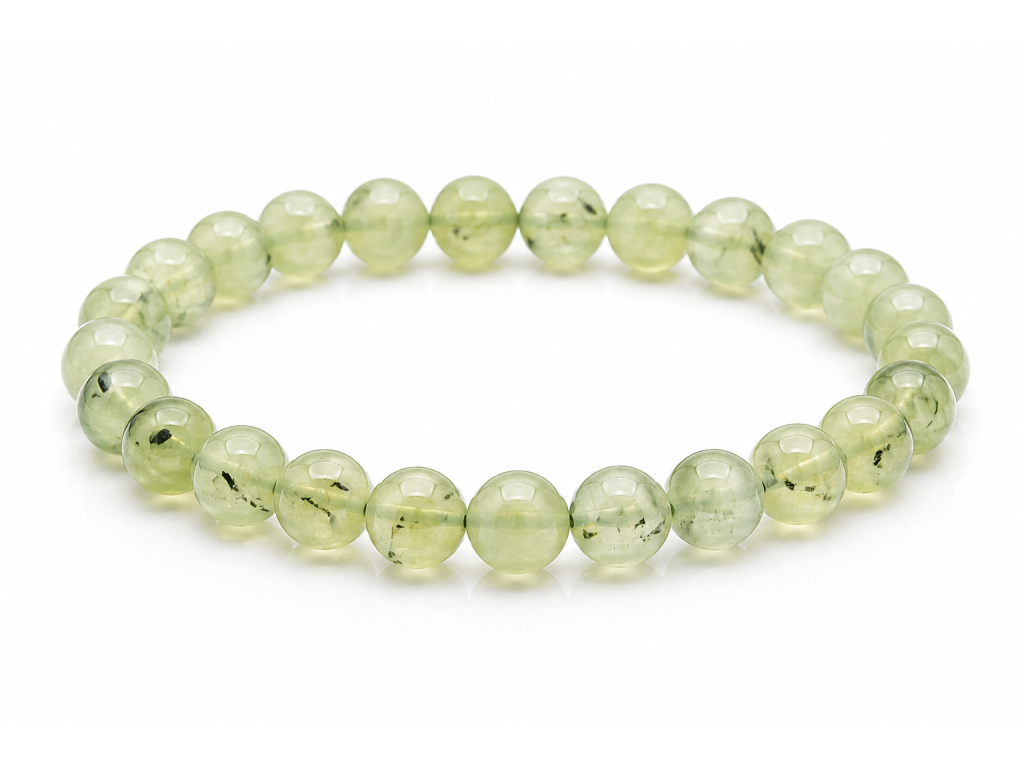 Náramek z prehnitu je jemný zelený šperk tvořený přírodními korálky s typickým mléčně průsvitným vzhledem. Barva se pohybuje od světle zelené po žlutozelenou a často obsahuje drobné tmavší inkluze. Prehnit patří mezi silikátové minerály a běžně se používá jako drahokam . Tradičně je spojován s klidem, harmonií a vnitřní rovnováhou.Obrázek je pouze ilustrativní. Původ: Čína